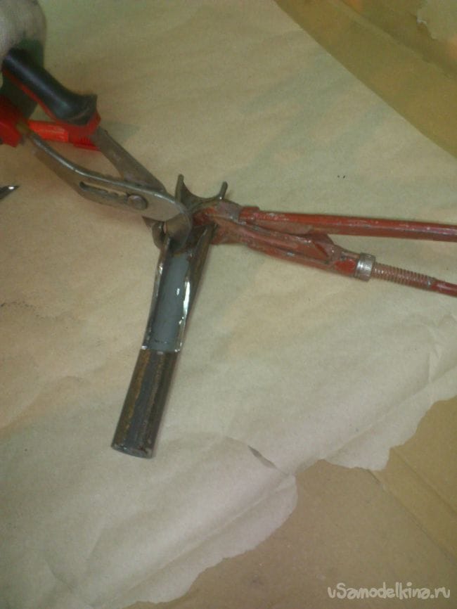 Это дало мне возможность развернуть трубу, используя два "рычага", в роли которых выступили подходящие по размерам рычажные инструменты: