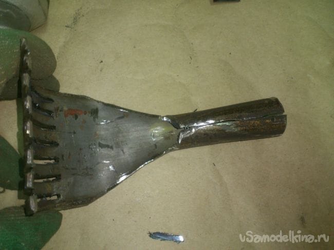 В процессе обнаружилось, что, загибая изделие под нужным углом и работая при этом молотком, я достаточно сильно расклепал стенки посадочного под черенок: