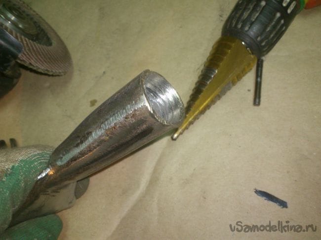 Потратив полчаса на безрезультатные поиски зенковки (А ведь лежит же где-то, зар-р-раза!!!)))), я раззенковал отверстие сверлом большого диаметра: