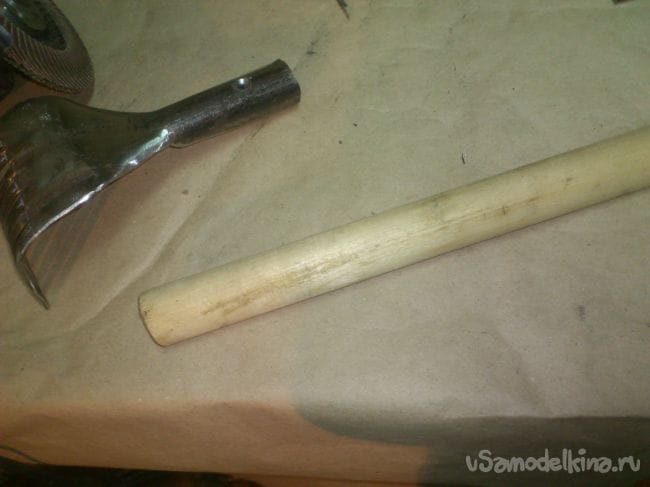 С "железом" пока всё!! Приступим к изготовлению черенка... Его я сделал из готового покупного черенка для грабель, который был у меня в запасе. (У меня всегда в запасе есть черенки различных диаметров... Я их использую как по прямому назначению, так и для самоделок))).