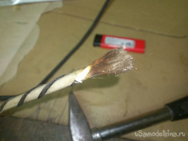 Когда он прогорит, на нужную мне длину, я его тушу... И получается кисточка. Ведь композитная арматура состоит из стекловолокна, пропитанного эпоксидным составом... Когда "эпоксидка" прогорит, остаётся только стекловолокно... Оно же не горит, как известно. Остаётся обрезать ножницами боковую спиральную обмотку и "пошуршать" новоявленной кисточкой по какой-нибудь поверхности, чтобы высыпались продукты горения... (Стекловолоконный ворс очень скользкий и сухой мусор в нём не задерживается - легко весь высыпается...