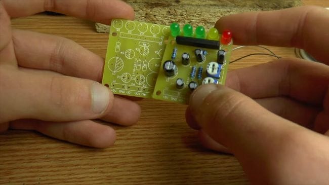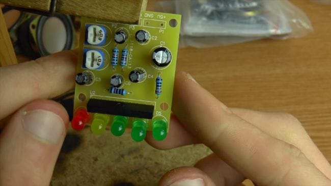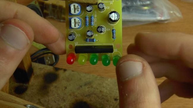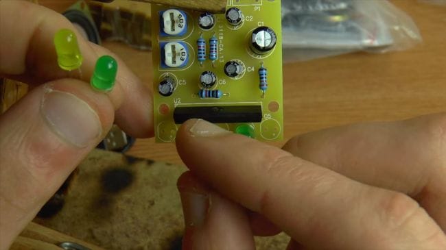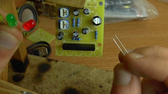 После этого устанавливаем светодиоды спектроанализатора, полярность определяется также, как и у конденсаторов, длинная ножка-плюс, короткая-минус. По порядку они располагаются так, сначала красный светодиод, потом желтый и три зеленых, слева направо.