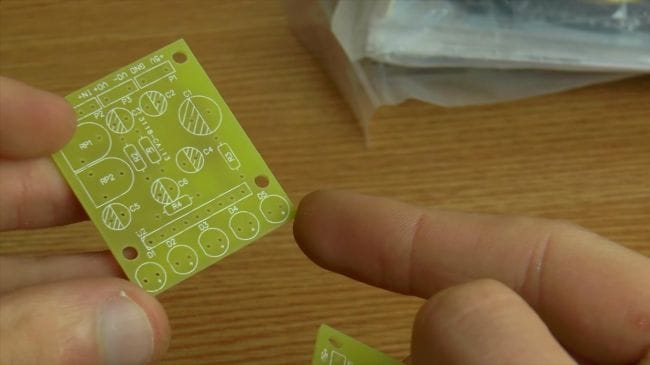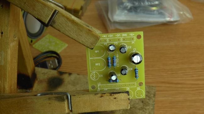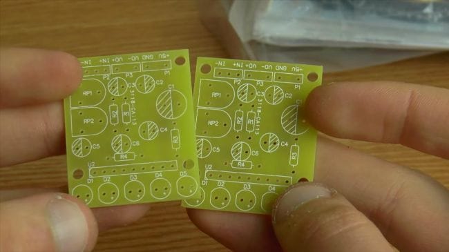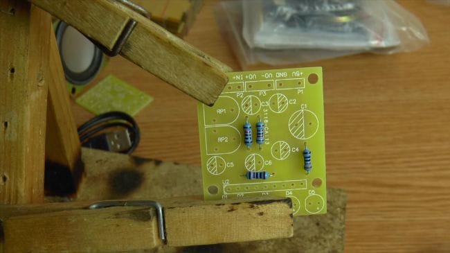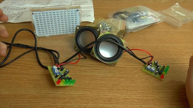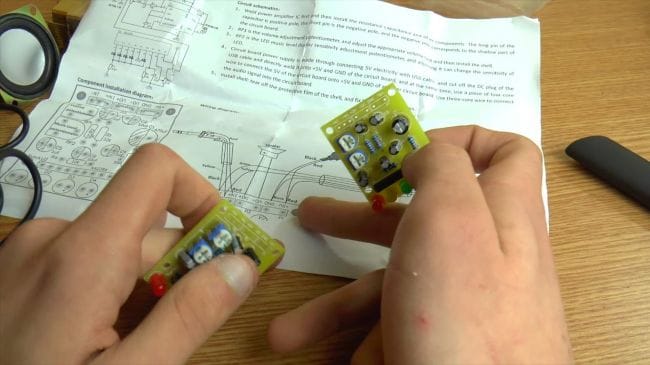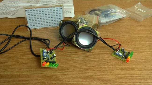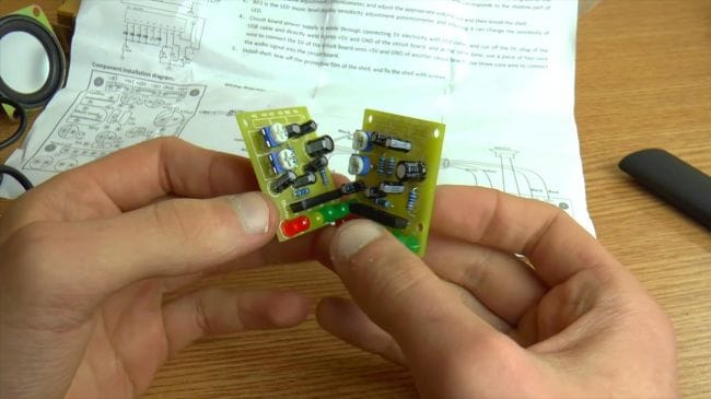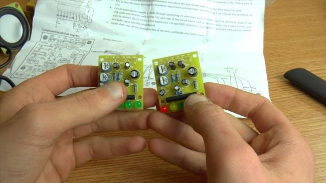 Также к кит-набору идут две печатные платы, которые будут устанавливаться в колонки со спектроанализатором через специальные проставки, на которых будут располагаться микросхема для светомузыки и SMD-микросхема усилителя.