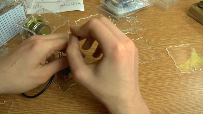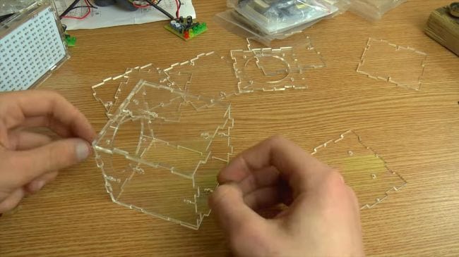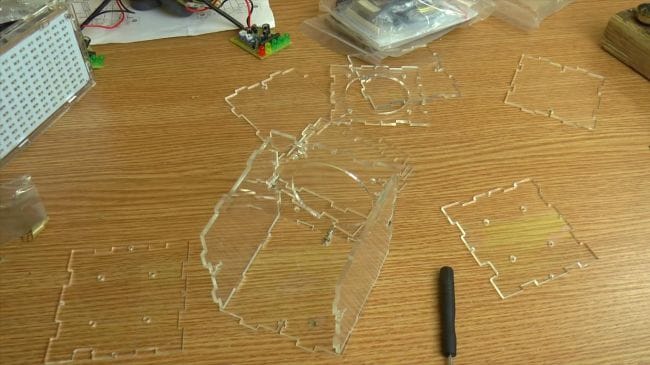 Собираем корпуса для колонок. С оргстеклянных пластин снимаем защитные пленки, далее собираем из них колонку, постепенно скручивая стороны винтиками при помощи крестовой отвертки.