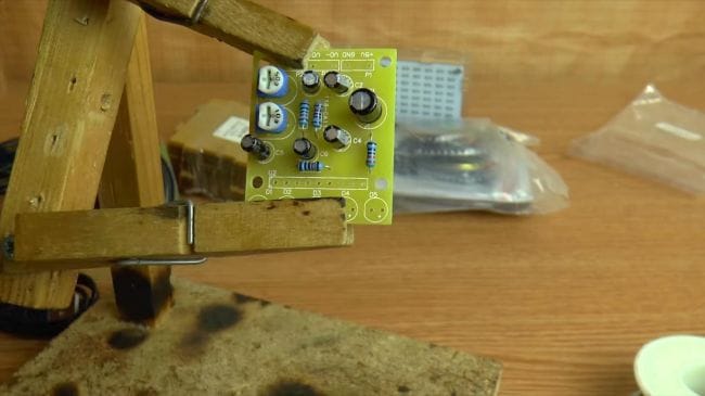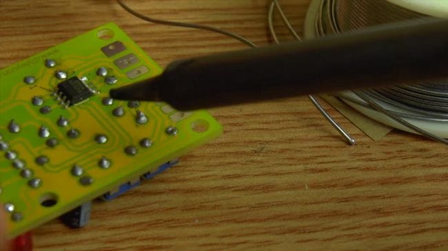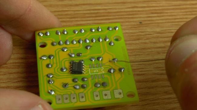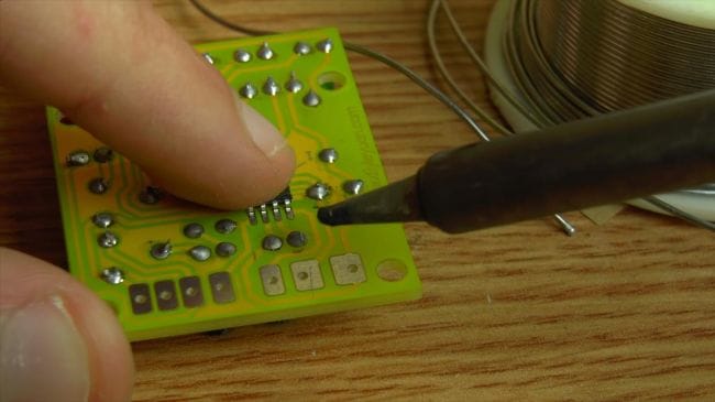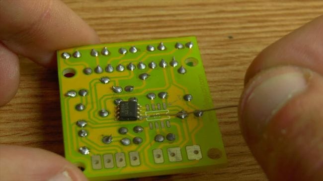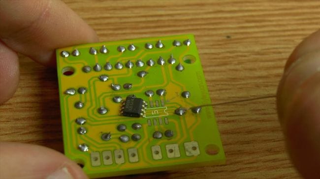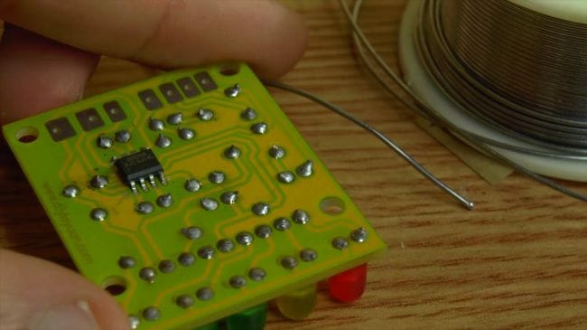 Припаиваем микросхему, чтобы сделать это проще, сначала припаиваем одну ножку, придерживая микросхему, а затем и все остальные выводы. При пайке старайтесь не перегреть микросхему, так ее можно легко вывести из строя.