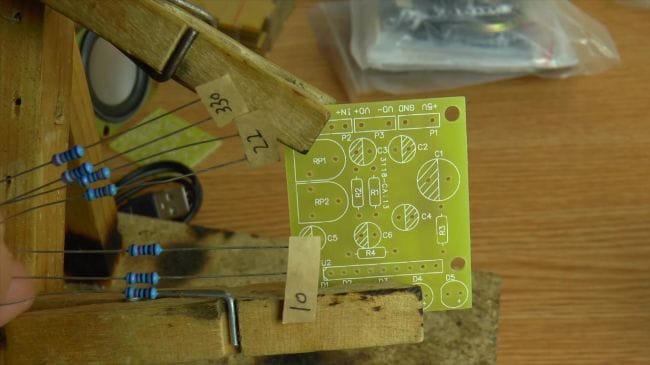 Первым делом начнем с резисторов, которых в комплекте в два раза больше, чем нужно. Скорее всего сделано это про запас. Определять номиналы данных резисторов не нужно, так как они уже подписаны изначально на бумажке. Номиналы резисторов смотрим по инструкции и согласно ей устанавливаем их на плате.