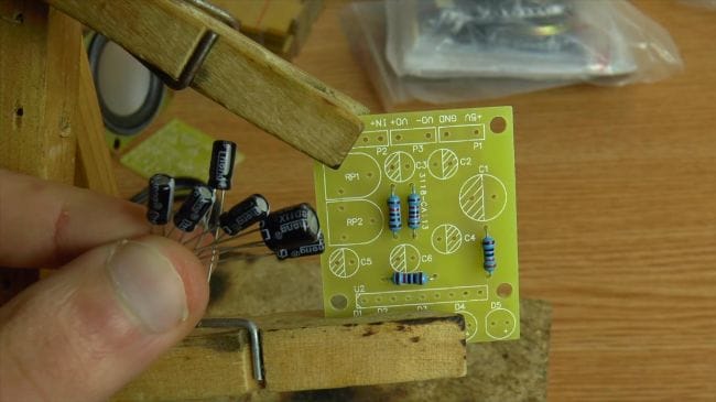 Теперь установим электролитические полярные конденсаторы. Полярность можно определить по длине выводов, длинная ножка это плюс, короткая-минус. Также на самом корпусе конденсатора указана полоска, напротив которой находится минусовой контакт. Номиналы конденсаторов смотрим по инструкции. На печатной плате полярность указана следующим образом, заштрихованный полукруг это минус, а другой, следовательно, плюс.