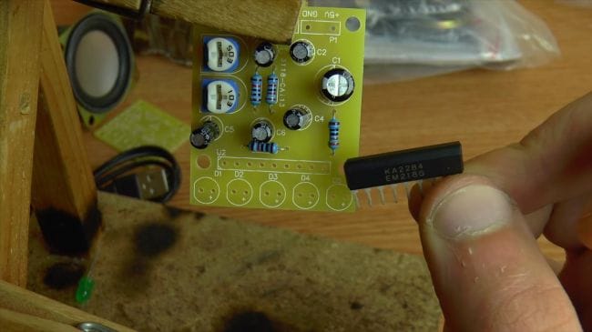 Далее ставим микросхему для светомузыки, при этом ориентируемся по скошенном краю на корпусе со стороны первого контакта, на плате этот скок также указан.