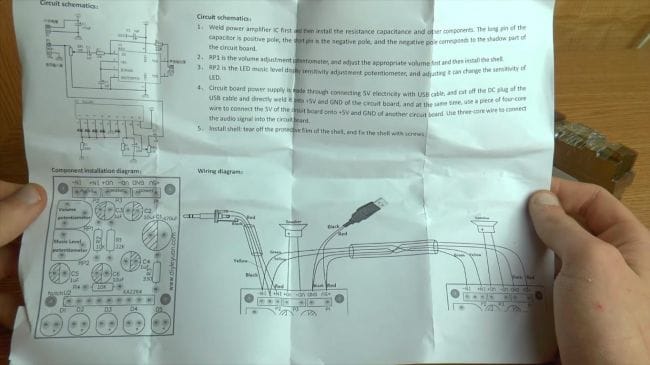 В комплекте есть инструкция на английском языке, на ней указаны некоторые моменты при сборке и наглядно показана схема подключения проводов и штекера к уже готовой плате усилителя.