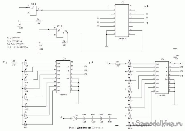 Первый вариант выполнен на микросхемах КМОП серии типа К561. По типу 2-х бегущих огней с разной частотой.