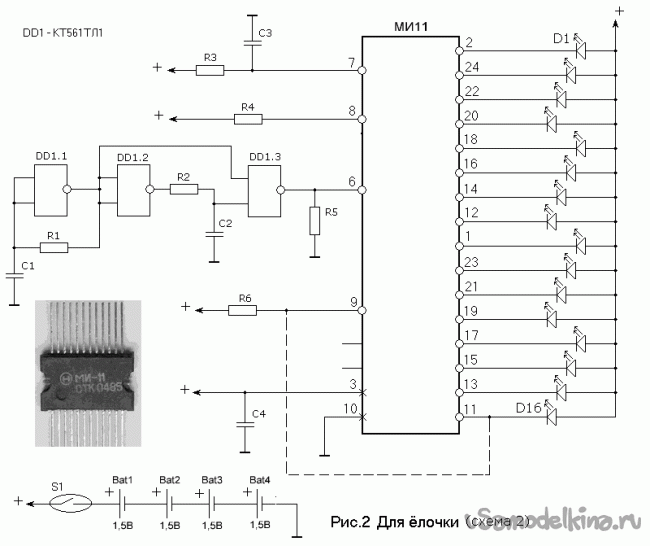 Второй вариант выполнен на н-МОП микросхеме МИ-11 (можно на ATtiny2313А) с одним бегущим огоньком.
