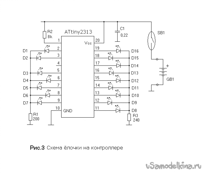 Принципиальные электрические схемы вариантов управления светодиодиками показаны на Рис.1(на серии К561), Рис.2 (на МИ-11) и Рис.3 (на контроллере ATtiny2313A)