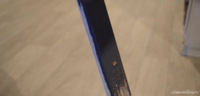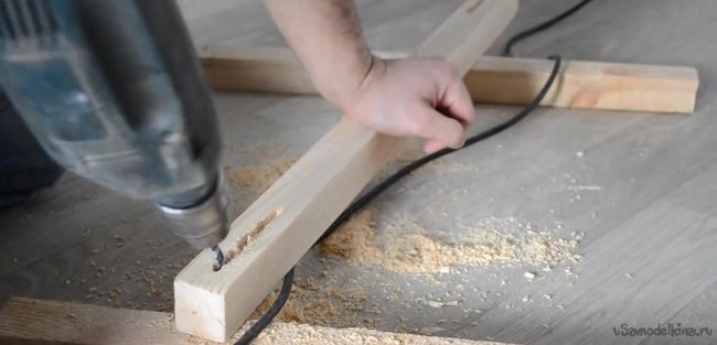 Берем брусок длиной 70 см, отмеряем по 1 сантиметру с двух краев и еще 13 см. Соединяем две точки и проделываем отверстия по линии. Отверстия должны быть близки друг к другу, чтобы позже было возможно соединить их в одну линию.