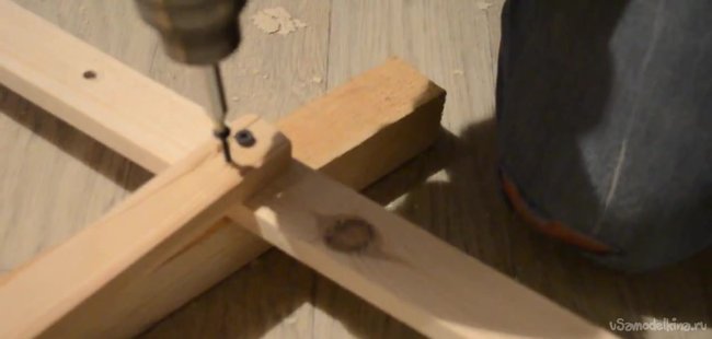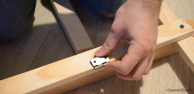 Крепим один конец лямки к ножке, а другой к среднему бруску, который соединяет две сторонние ножки.
