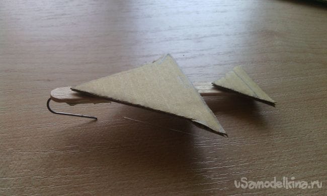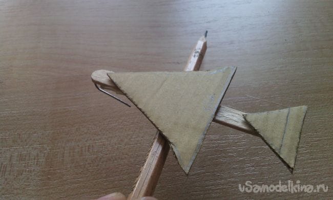 И крепко приклеиваем к "носу" нашего самолёта (также ещё можно примотать нитками, чтобы было по крепче) :
