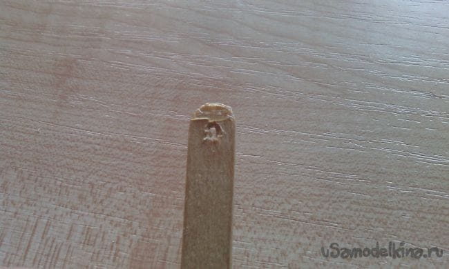 Приступим к изготовлению катапульты, берём другую палочку от мороженного и делаем в ней дырку: