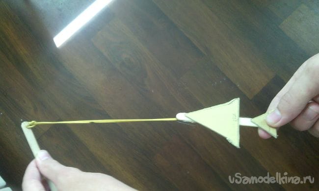 Для того чтобы запускать такой самолёт нужно зацепить резинку о скрепку, натянуть и запускать, но не в коем случае не запускайте его в людей!