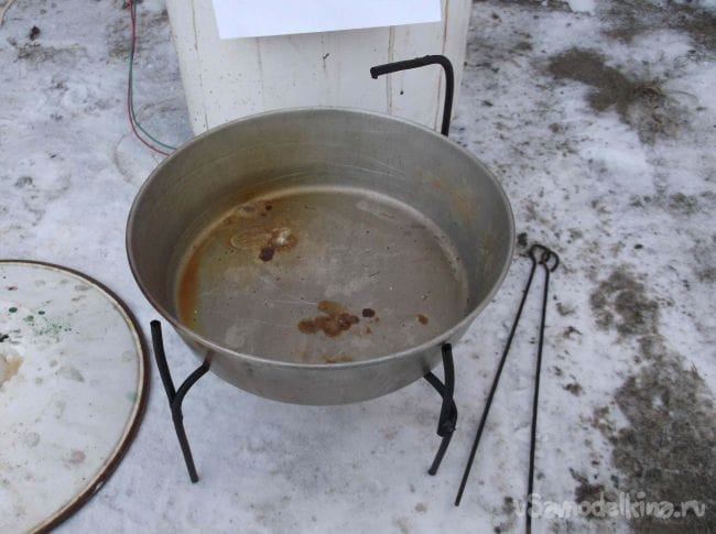 В верхней части колбы сверлим отверстия для шампуров, на которые в будущем будут подвешиваться продукты. Сами шампура сделаны из проволоки диаметром 4 или 5 мм.
