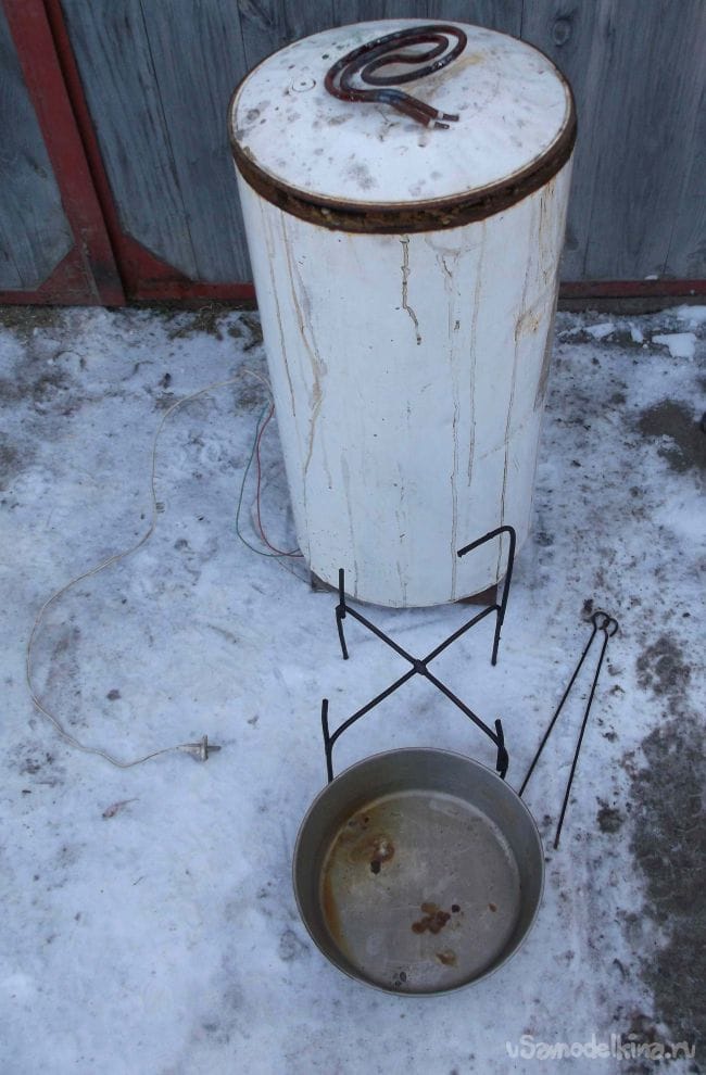 Всем здравствуйте! Решил написать про создание своей коптильни, которой пользуюсь круглый год. На мой взгляд, использование электрической коптильни намного удобнее по сравнению с обычной, для нагрева которой используется открытый огонь. Загрузил щепу, продукты для копчения, включил в розетку, и осталось только немного подождать. Ну, а началось все с того, что мне на глаза попался старый электрический титан. Выбросить отслужившую свой срок вещь – дело не хитрое, но сложнее сделать так, что бы, казалось ненужная, на первый взгляд, вещь стала полезной. Идея пришла, когда в очередной раз решили коптить рыбку. До этого мы коптили в эмалированном ведре на электроплитке. А зимой еще и приходилось утеплять ведро, чтобы внутри было легче поддерживать нужную температуру. Колба водонагревателя с заводским утеплением, почти идеально, подходит для изготовления электрической коптильни.