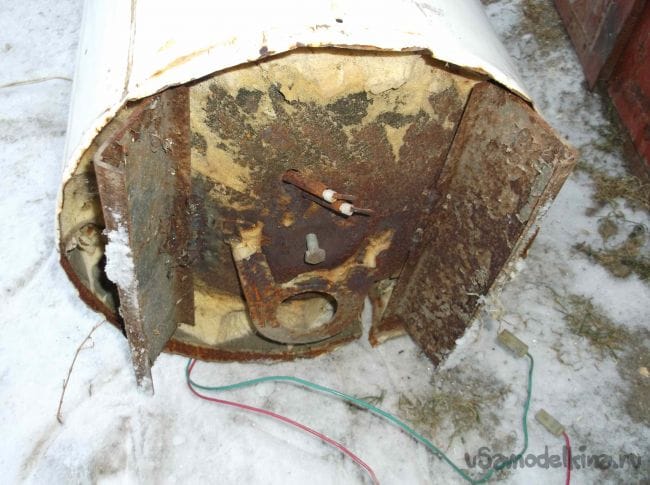 Далее, счищаем утеплитель до боковых стенок. Привариваем ножки из кусков уголков или что есть под рукой - это не принципиально, главное, чтоб конструкция была устойчива. С другой стороны нашей конструкции, срезаем кожух вместе с дном колбы.