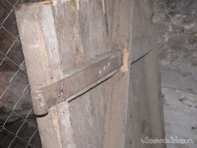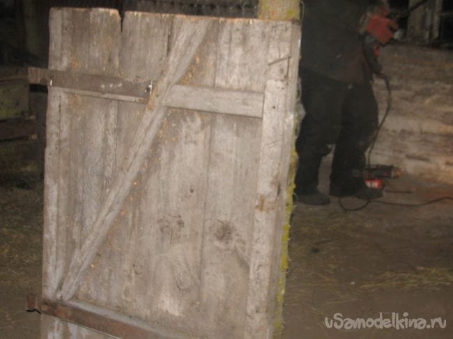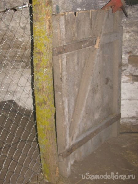 Что касается входной двери, то она была сделана из обычной старой двери, я просто отрезал от нее лишнее. В итоге остался один навес на своем месте, а второй пришлось установить заново. Было лень искать болты, сверлить отверстия и так далее, в итоге я просто прибил навес по два гвоздя одно отверстие.