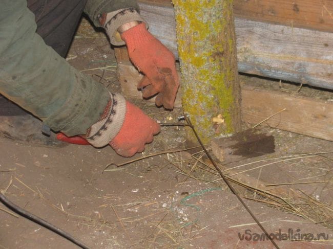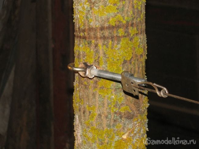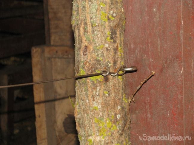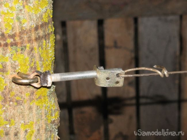 Что касается проволоки, то ее стибрил со старой радиолинии. Диаметр проволоки миллиметра 3, но довольно мягкая, прекрасно гнется. Сделал на проволоке петли, установил натяжитель и ключом на «17» натянул верхнюю. Нижнюю проволоку натянули от руки, потом она была прибита к полу гвоздями, так что тут особое натяжение не понадобилось.