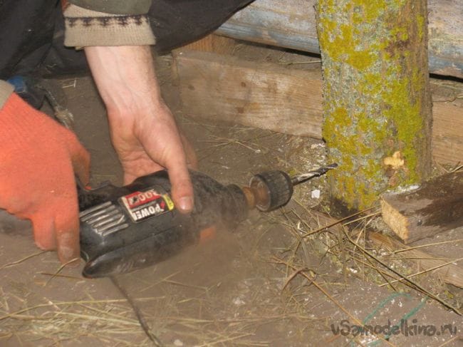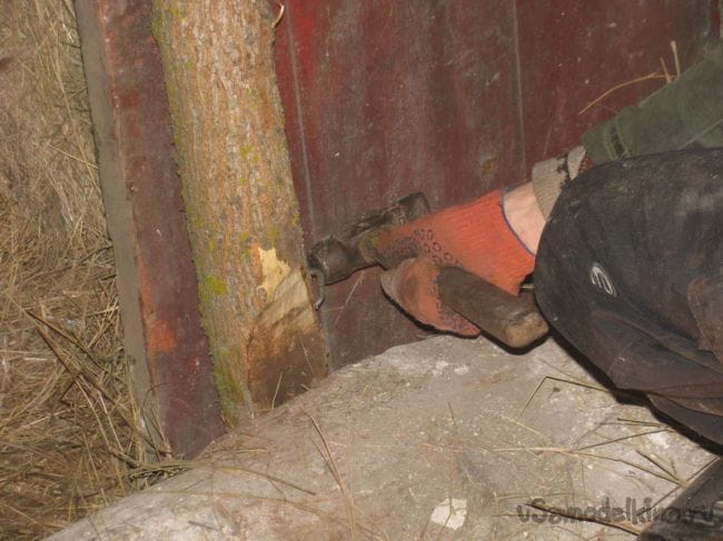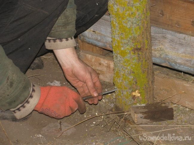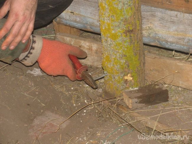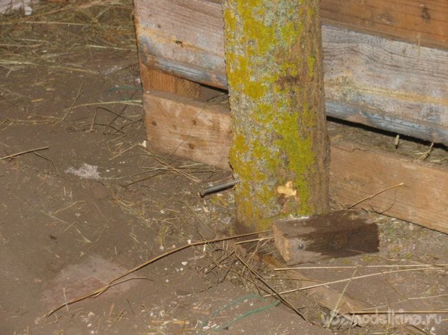 Сначала мы установили два столбика, один нужен для калитки, а второй использовался, чтобы расширить площадь вольера. Столбики использовал кленовые, которого тут навалом. Просверлил вверху и внизу столбов по три отверстия и хорошо прибил к полу и потолку гвоздями (сотками). Для одного столбика прибил еще опоры из брусков и через эти упоры тоже забил гвозди в столбики для надежности. Всегда сверлите клен при вбивании больших гвоздей, иначе сразу раскалывается.
