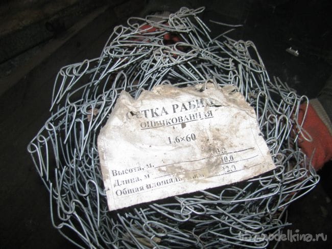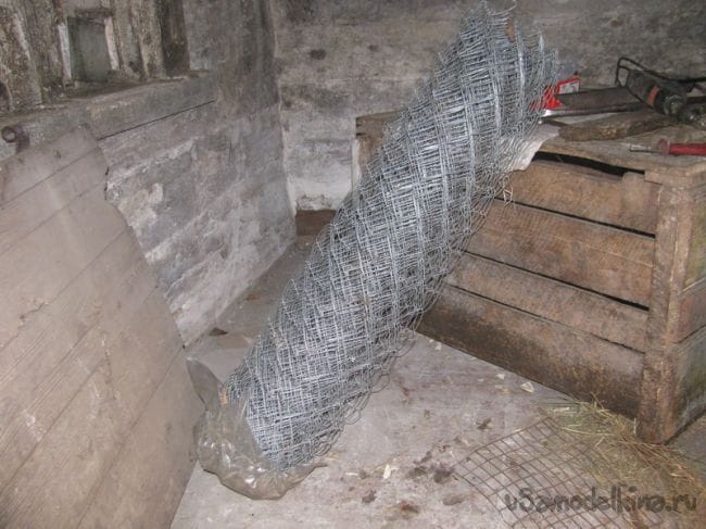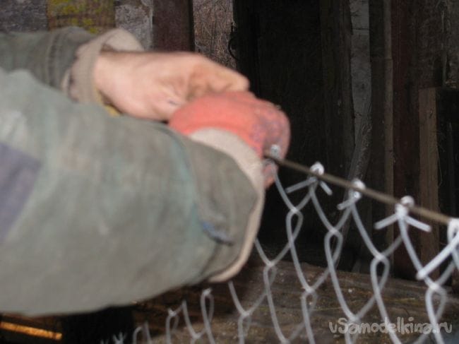 Далее берем гвозди (70 или 50) и прибиваем сетку к полу через одну ячейку. Как раз это должны быть те места, где сетка не прикручена проволокой. В завершении подтягиваем верхнюю проволоку и имеем надежно закрепленную сетку.