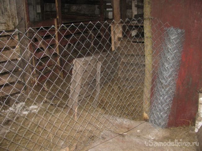 Материалов для изготовления полноценного вольера не оказалось, а строить из кривых палок изгородь долго и плачевно, а времени мало. Нашелся у нас рулон сетки рабицы, было принято решение попробовать построить из нее временный вольер для поросят. Раньше мы уже делали подобную загородку в сарае для коз, и она вполне справилась с этой задачей.