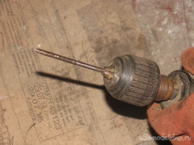 Вбивать гвозди пришлось в дуб, а без сверления это сделать почти не реально. Сверла под гвозди маленького диаметра не оказалось, решил попробовать сверлить гвоздем!)) И не промахнулся, правда гвоздь не сверлит, а прожигает древесину, причем отверстия проделываются не медленнее, чем сверлом. Правда, образуется много дыма. В итоге получаем идеальное отверстие под гвоздь. До конца я их не сверлил, чуть больше половины длины гвоздя, которые забивал. Сверлил соткой.