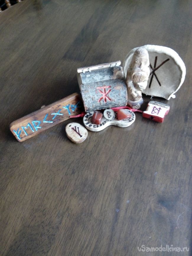 Для изготовления используется натуральный материал: дуб, дук, осина, сирень, кипарис, калина. Каждое выполненное изделие направлено на реализацию задачи в помощи достижения, защиты. Механическая обработка, вырезание, огонь, масло воск и смолы. Начертаны руны и рунические формулы. Хозяйские хоромы, предметы .. Возможен подвес из серебра.