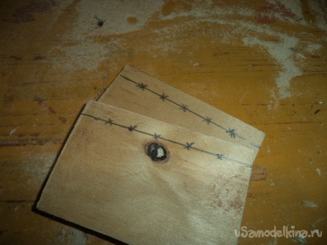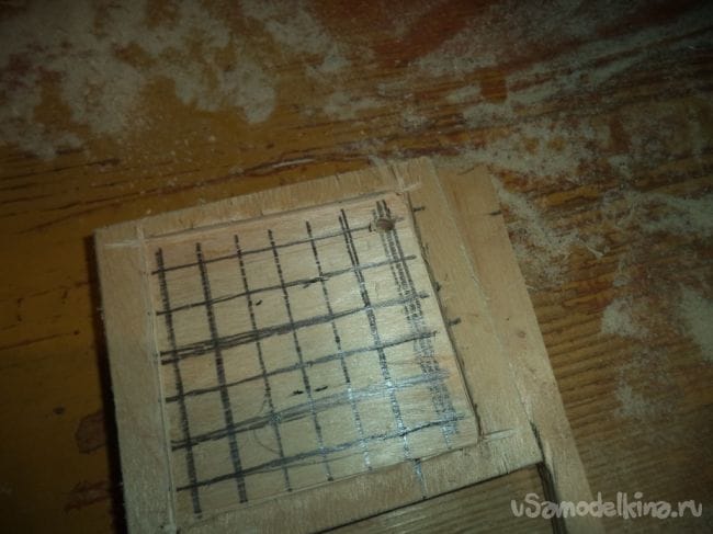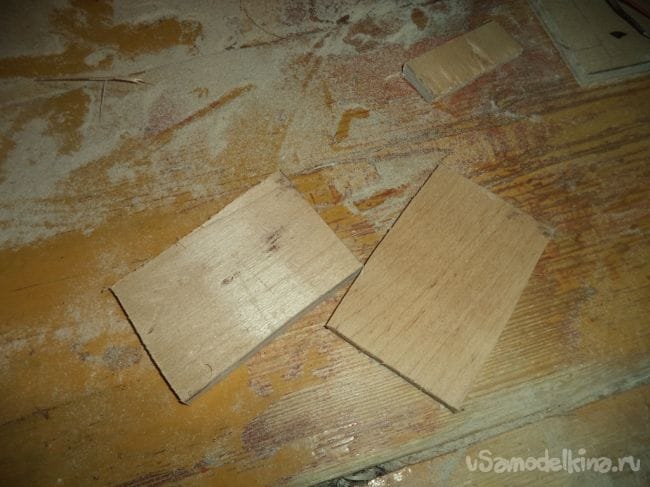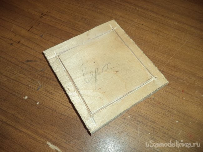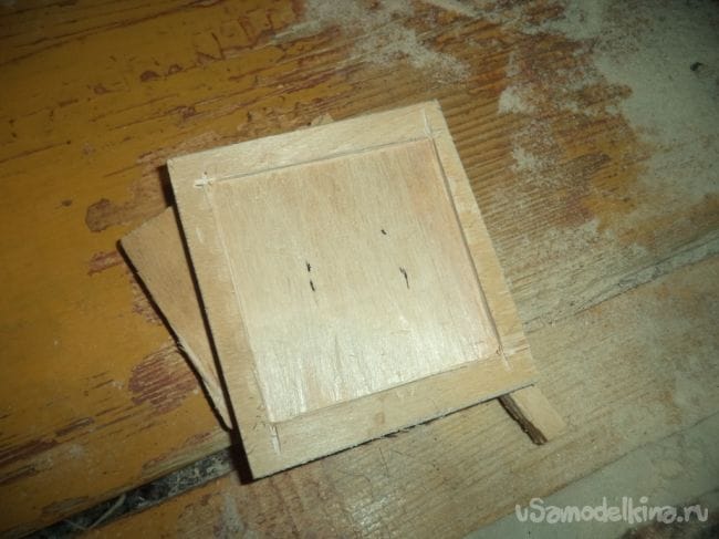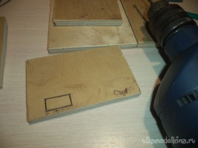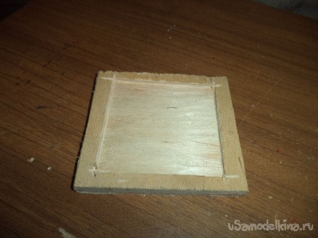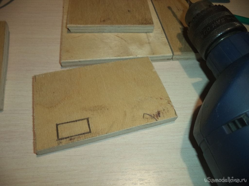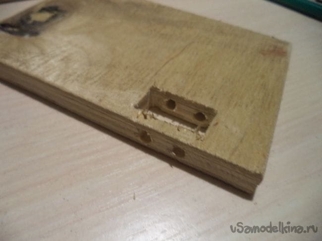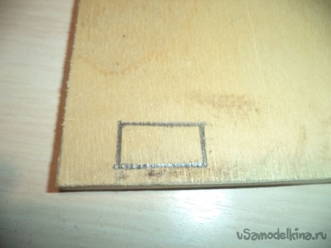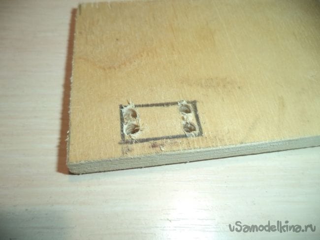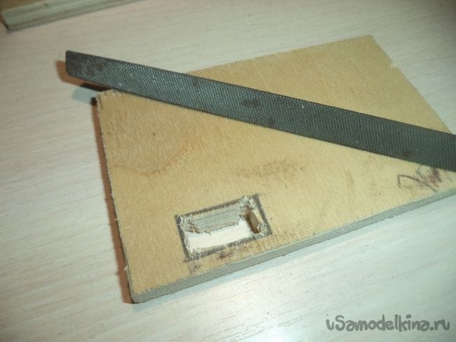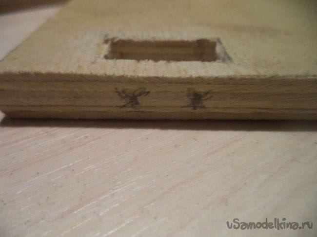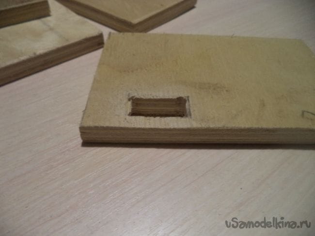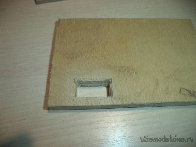 На оставшейся детали, у которая больше предыдущих боковых деталей, изготавливаем прямоугольное отверстие и прямоугольные углубления.