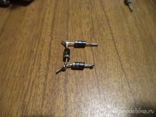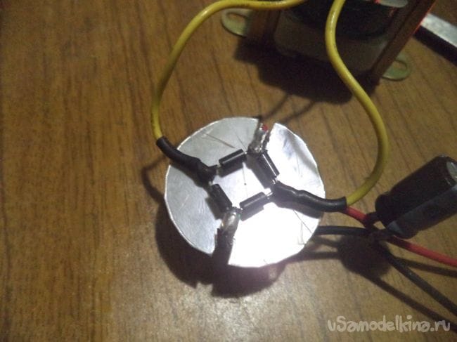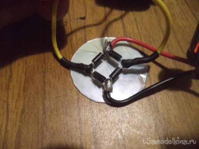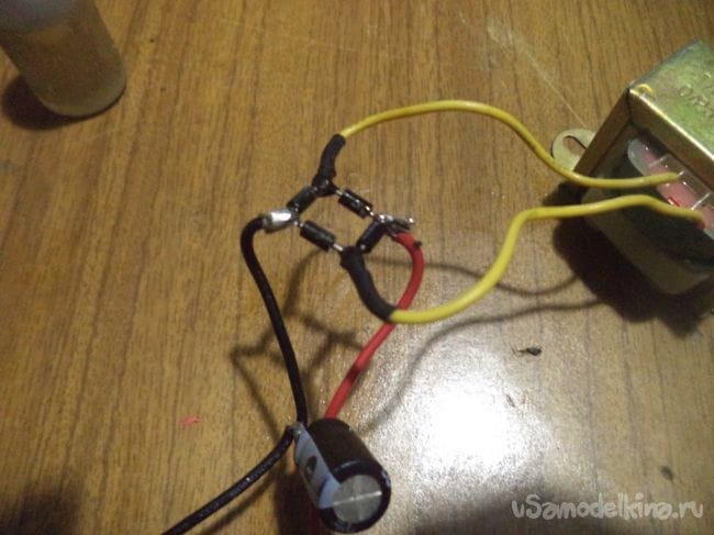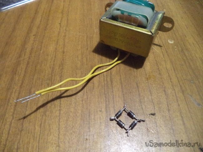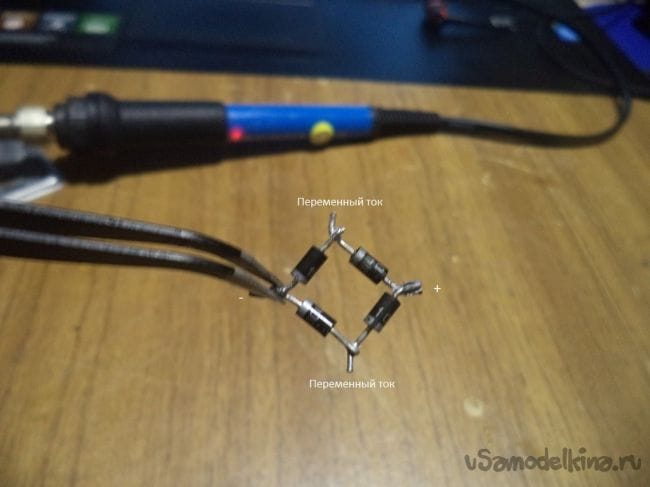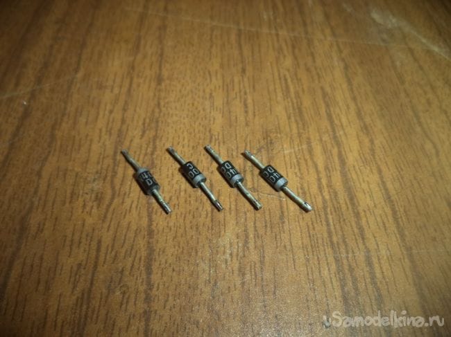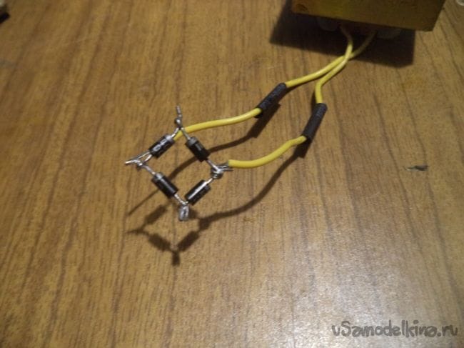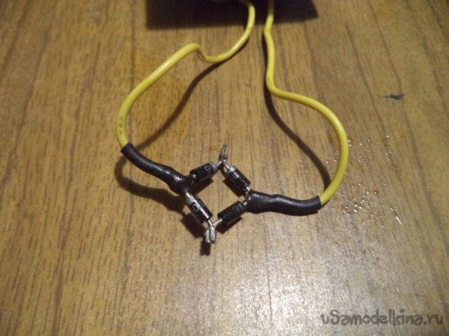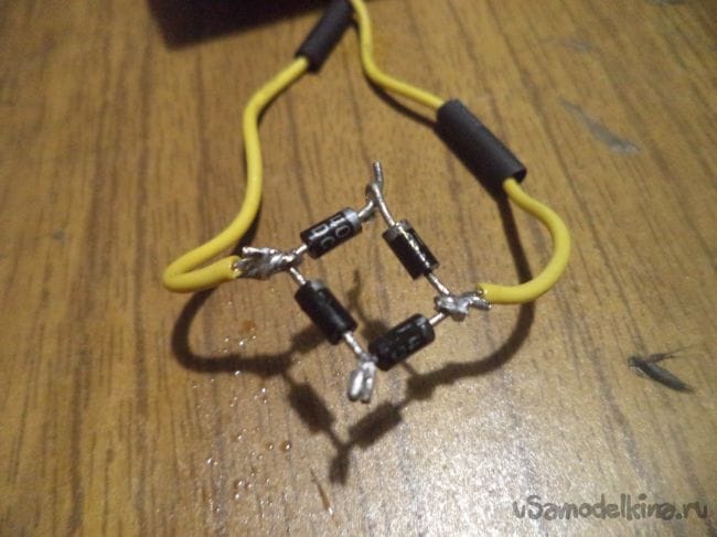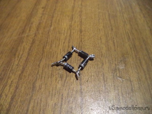 В начале же берем четыре диода и собираем из них диодный мост, который будет преобразовывать переменный ток в постоянный, как я упоминал ранее.