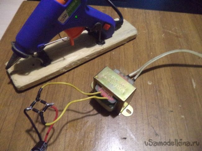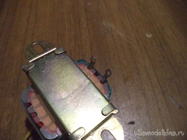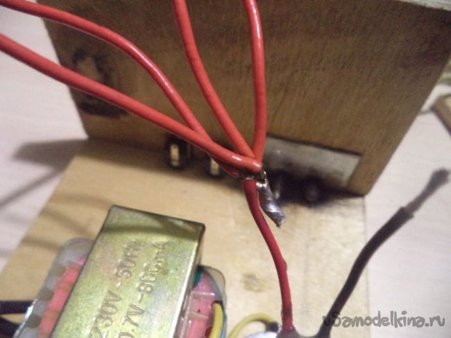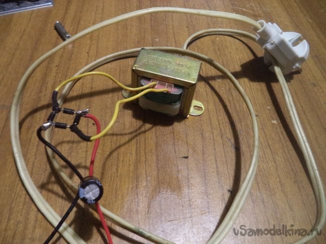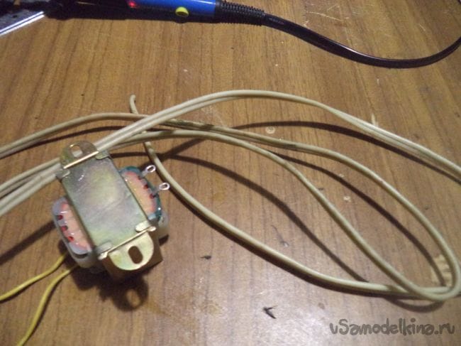 Теперь припаиваем к понижающему трансформатору напряжения провод, с помощью которого трансформатор будет подключаться к сети 220 вольт.