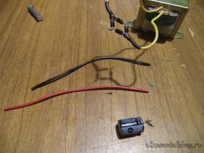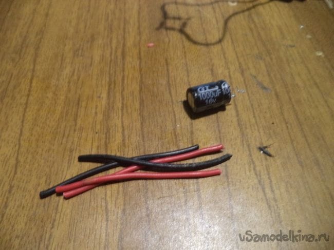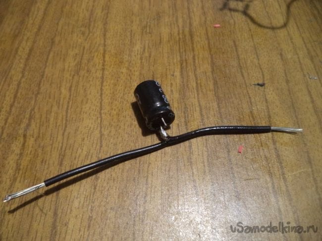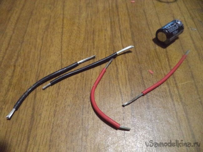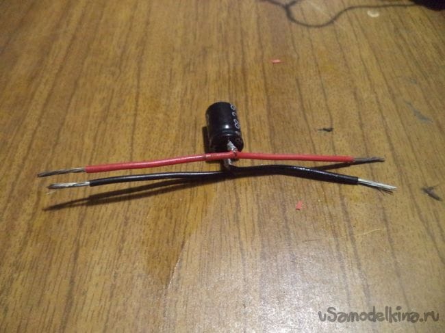 Для этого нам понадобятся проводки черного и красного цвета, так как контакты конденсатора малы для припаивания к мосту.
