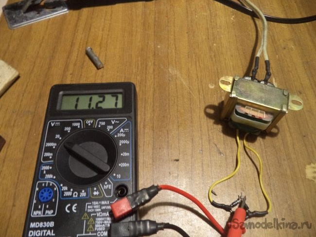 Проверяем показания получившейся цепи с помощью мультиметра. Как видно, выдается напряжение пока 11,27 вольт. Далее показания еще изменятся.