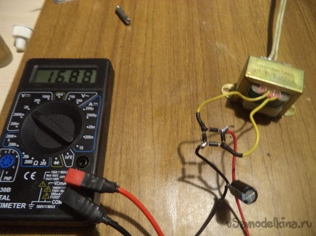 После припаивания конденсатора напряжение на выводах увеличилось до 16.88 вольт.