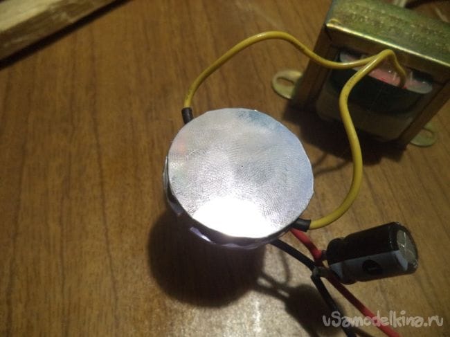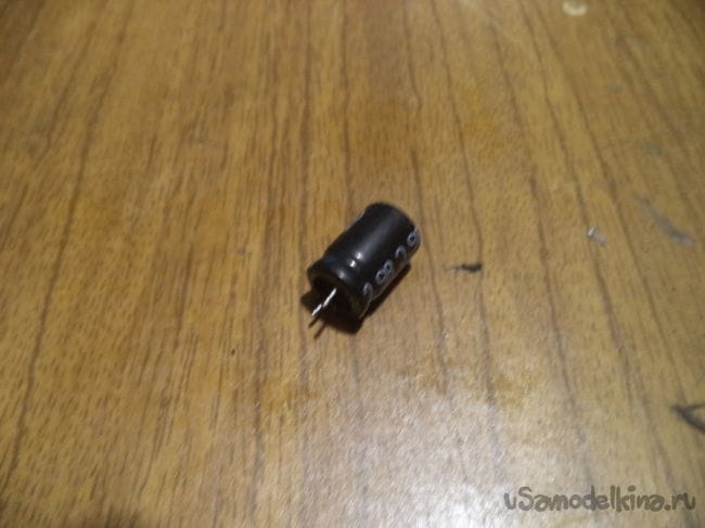 Теперь к плюсу и минусу выпрямительного диодного моста, соблюдая полярность, припаиваем конденсатор, который будет сглаживать колебания напряжения посте диодного моста.