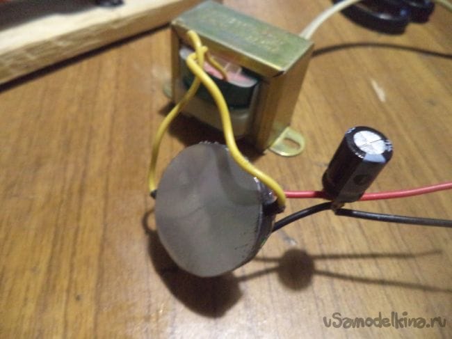 Теперь припаиваем диодный мост к понижающему трансформатору напряжения.