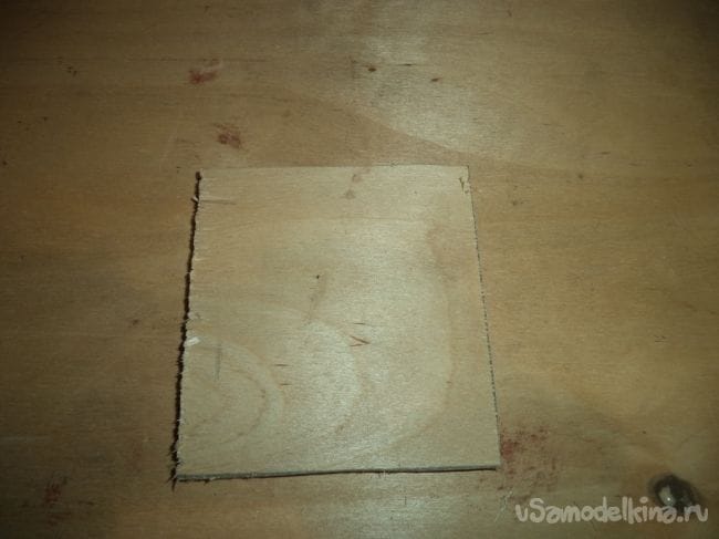 Далее с помощью металлорезки выпиливаем этот квадратик. Почему с помощью металлорезки, потому что с помощью обычной ножовки края фанеры трескаются, а с помощью металлорезки нет.
