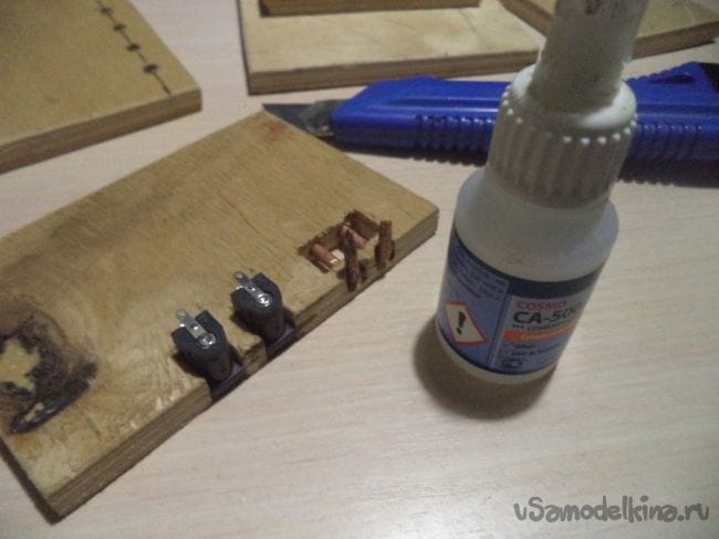 Вставляем разъемы на свои места и клеим их супер клеем.
