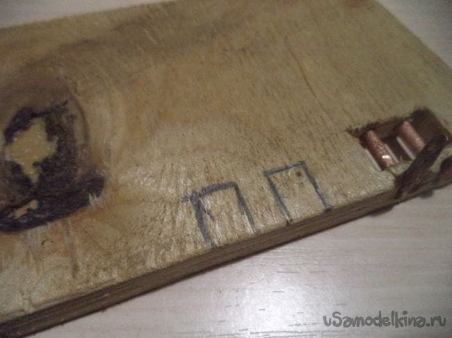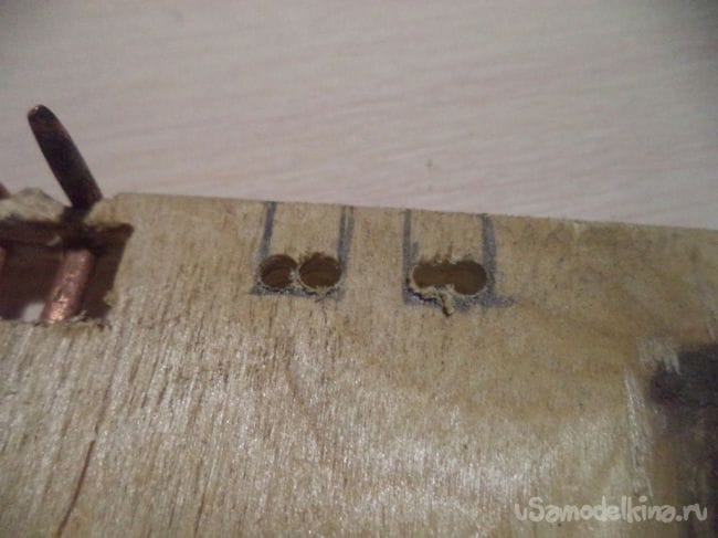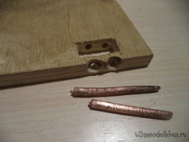Для этого сквозь это прямоугольное отверстие сверлим два одинаковых отверстия диаметром в эту медную проволоку.