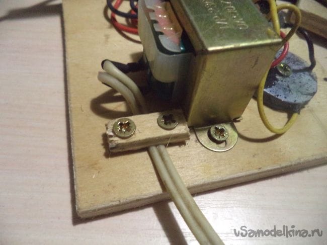 Теперь закрепляем провод, который будет подключаться к 220 вольт следующим образом.