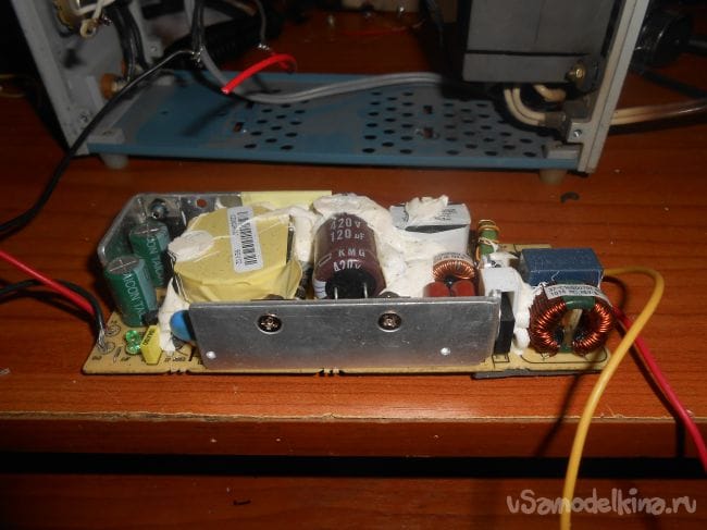 Если демонтировать трансформатор, выпрямитель, 2 здоровых конденсатора и воткнём вместо всего этого зарядку от ноутбука, то запросто получим БП на двадцать вольт и пять ампер. Всё зависит от характеристик зарядки.