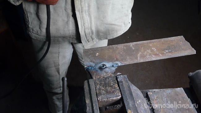 Привариваем рессору к обрезку топора. Предварительно снимаем фаски с топора и рессоры, сварку производим в три прохода, с обоих сторон. Также необходимо дожидаться полного остывания каждого шва, чтобы минимализировать перегрев.