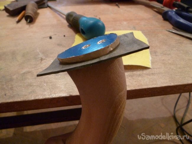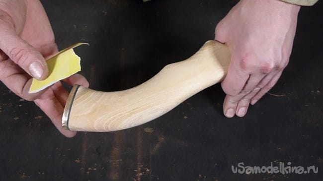 Если навершие не плотно прилягло к рукояти между ними можно вставить кусок резины от автомобильной камеры, при затягивании саморезов она скроет неровности.