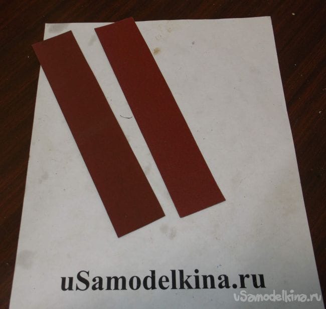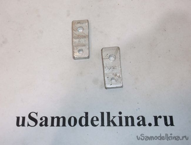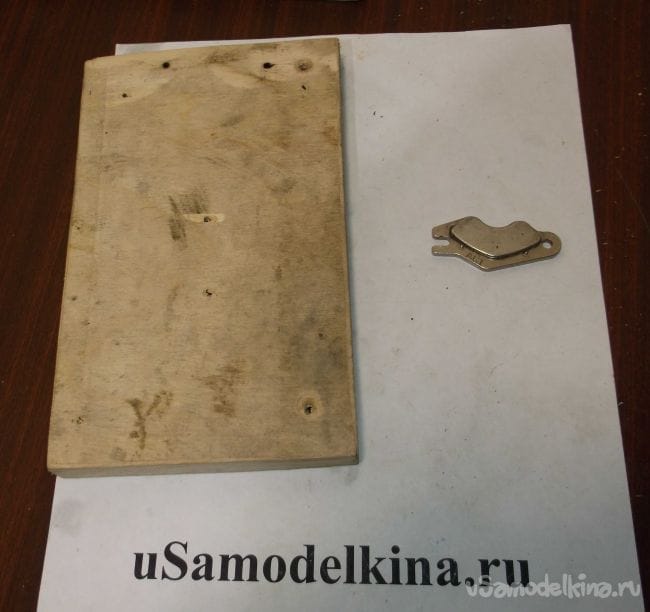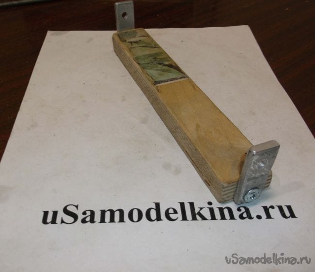 Из отрезков 1,5 на 4 см выполненных из стальной или дюралевой пластины изготовлены держатели для бруска, в которых просверлены по краям два отверстия 6,5 мм.