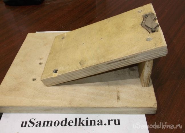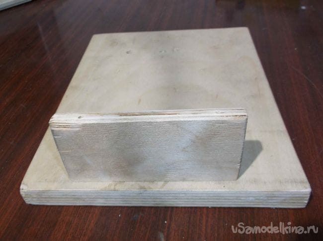 Первым делом выпиливается основание из восемнадцати миллиметровой фанеры примерно 25 на 18 сантиметров. К подготовленному основанию крепиться брусок, на ребро, из той же фанеры с размерами 11 на 5 см. при помощи саморезов, с предварительным засверливанием, для исключения растрескивания деталей. Должно получиться так же как на фото.