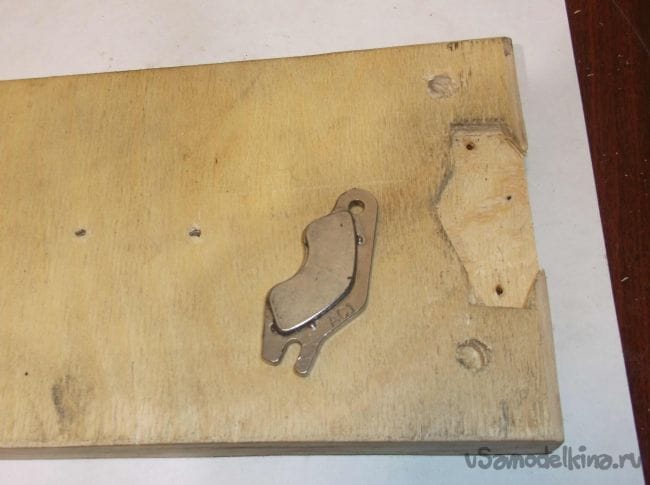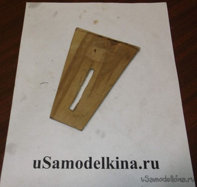 Из трехслойной фанеры вырезан упор с размерами: длинна – 13см, ширина с одной стороны – 9 сантиметров с другой 3 см и пропилом посередине шириной 6,5 мм и длинной 60 мм как на фото.
