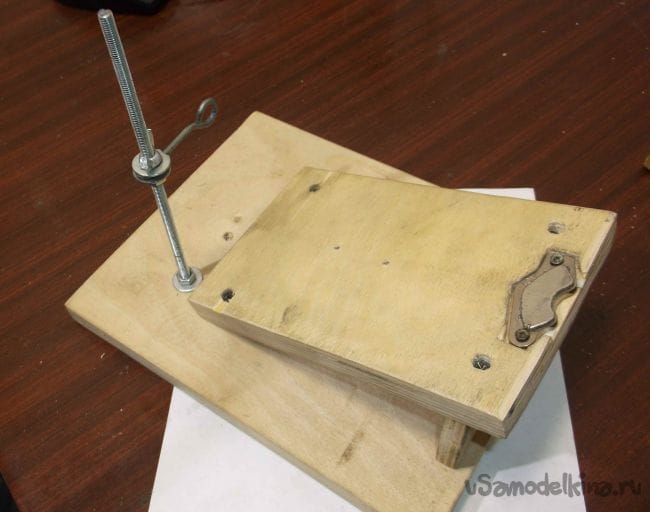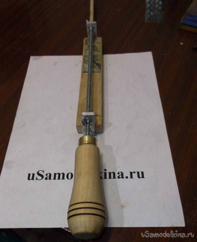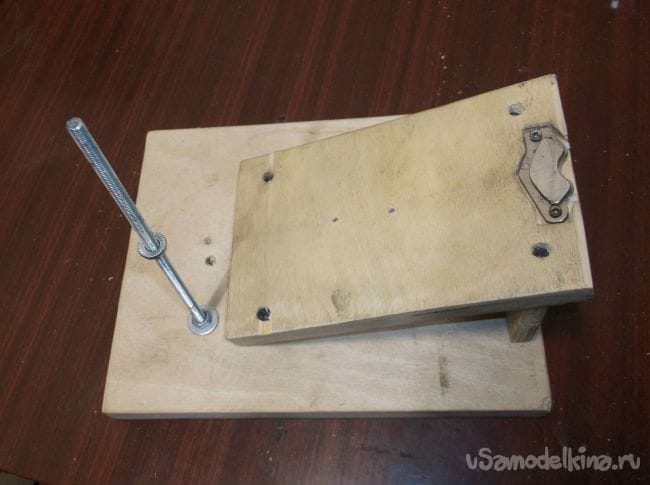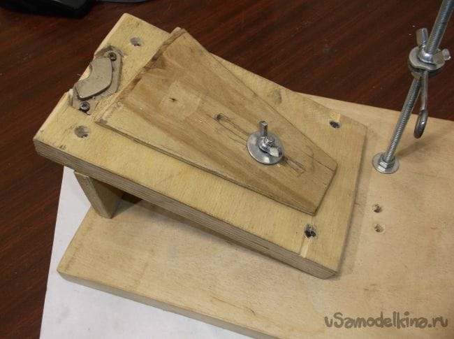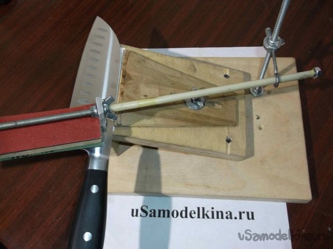 Рядом с одним из нижних углов «столешницы» закрепляется шпилька 6мм, и длинной примерно 20 см. При помощи этой шпильки будет регулироваться угол заточки.